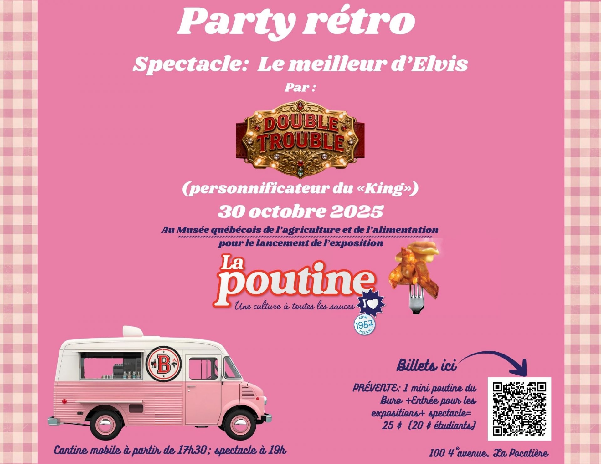 L’invitation s’adresse à qui veut découvrir notre relation à la poutine, aux gens qui aiment en manger, aux fans d’Elvis, tout autant qu’à celles et ceux qui souhaitent bouger, chanter et danser sur sa musique. À la veille de l’Halloween, les nostalgiques sont priés de se déguiser et, pourquoi pas, à retrouver leur style vestimentaire de l’époque des cantines et des scopitones !
